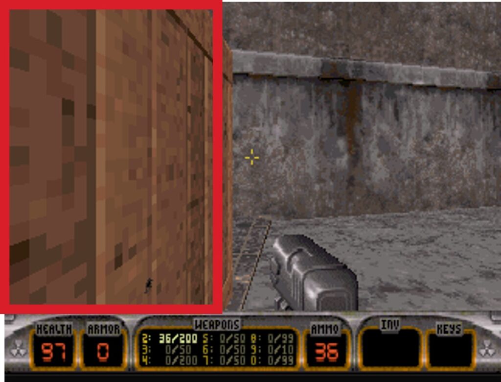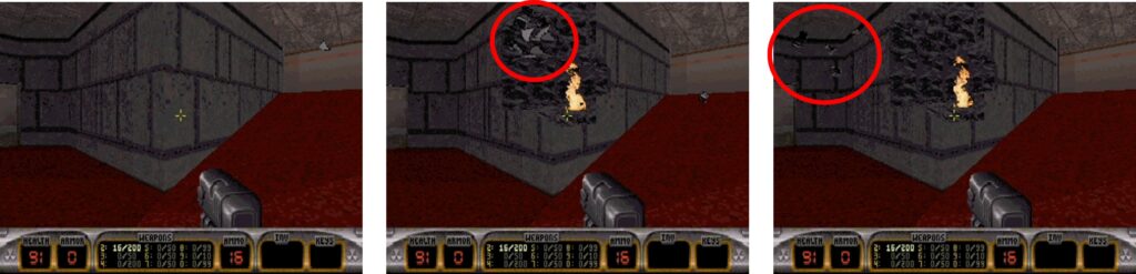 Noticeably, each level contains hundreds of sprites that remain static. These include wall or floor/ceiling decals—sprites painted onto surfaces that never change. This approach allowed the creators to reduce the number of textures while still adding visual variety.