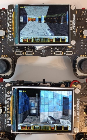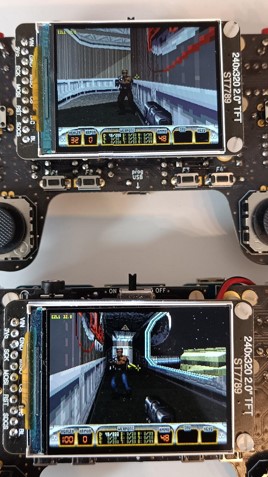 Without overclocking, performance is approximately 1.7x slower, averaging above 18 FPS and peaking at 27–30 FPS. Even then, it outperforms the ESP32 port, which runs at twice the frequency, with lower resolution, no music, and no multiplayer.