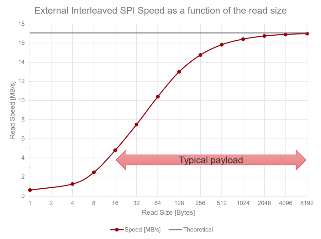 Altogether, this results in a latency of approximately 1.6 µs, corresponding to a read speed of only 600 kB/s—more than 50 times slower than random reads from internal flash.