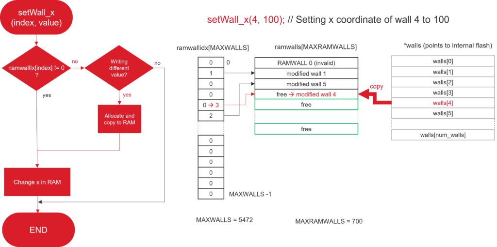 The general idea we took was to statically declare for each object an array of RAM structures with a smaller number of elements (the particular value being found by profiling/playing the game). Now, instead of accessing directly the data, like walls[i].x, we created setters and getters, so that one can retrieve the same data by calling getWall(i)->x or getWall_x(i). These setters and getters will use an array of indexes (e.g. rammwallidx), to check whenever the object was modified. If it was modified (non-zero index), then the RAM structure is used. If it was not modified (index is zero), the structure in flash is used instead. When trying to set a property, the setter will first check if the object was already modified, and in such case it will access the object in RAM and modify the property accordingly. Otherwise, it will check if the new property value differs from what is in flash. If this still is not the case, a new object in RAM is allocated from the array, and its index is copied to the array of indexes.